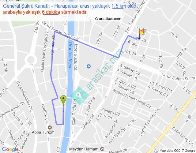 General Şükrü Kanatlı - Haraparası arası yaklaşık olarak 90 km/h ile yukarıda belirtilen sürede olup, iki yerin kuş uçuşu uzaklığı (mesafesi) 1'dir. Yolculuk otobüsle 7 dakika sürmektedir.