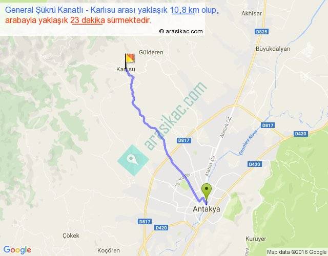 General Şükrü Kanatlı - Karlısu arası yaklaşık olarak 90 km/h ile yukarıda belirtilen sürede olup, iki yerin kuş uçuşu uzaklığı (mesafesi) 9'dir. Yolculuk otobüsle 29 dakika sürmektedir.