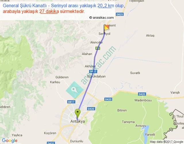 General Şükrü Kanatlı - Serinyol arası yaklaşık olarak 90 km/h ile yukarıda belirtilen sürede olup, iki yerin kuş uçuşu uzaklığı (mesafesi) 19'dir. Yolculuk otobüsle 35 dakika sürmektedir.