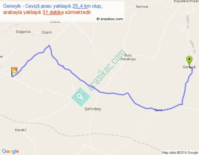 Geneyik - Cevizli arası yaklaşık olarak 90 km/h ile yukarıda belirtilen sürede olup, iki yerin kuş uçuşu uzaklığı (mesafesi) 17'dir. Yolculuk otobüsle 40 dakika sürmektedir.