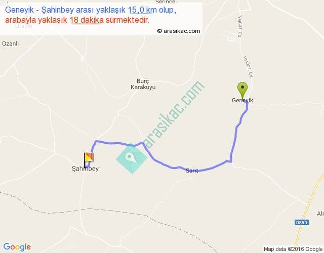 Geneyik - Şahinbey arası yaklaşık olarak 90 km/h ile yukarıda belirtilen sürede olup, iki yerin kuş uçuşu uzaklığı (mesafesi) 10'dir. Yolculuk otobüsle 23 dakika sürmektedir.
