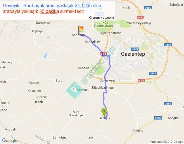 Geneyik - Sarıbaşak arası yaklaşık olarak 90 km/h ile yukarıda belirtilen sürede olup, iki yerin kuş uçuşu uzaklığı (mesafesi) 18'dir. Yolculuk otobüsle 45 dakika sürmektedir.