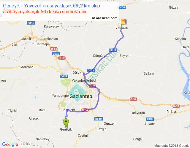 Geneyik - Yavuzeli arası yaklaşık olarak 90 km/h ile yukarıda belirtilen sürede olup, iki yerin kuş uçuşu uzaklığı (mesafesi) 47'dir. Yolculuk otobüsle 1 saat 12 dakika sürmektedir.