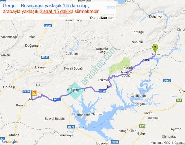 Gerger - Besni arası yaklaşık olarak 90 km/h ile yukarıda belirtilen sürede olup, iki yerin kuş uçuşu uzaklığı (mesafesi) 109'dir. Yolculuk otobüsle 2 saat 55 dakika sürmektedir.