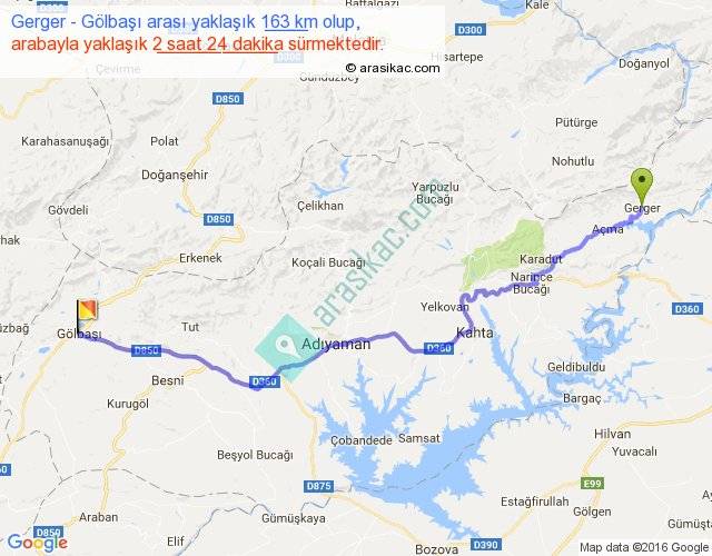 Gerger - Gölbaşı arası yaklaşık olarak 90 km/h ile yukarıda belirtilen sürede olup, iki yerin kuş uçuşu uzaklığı (mesafesi) 124'dir. Yolculuk otobüsle 3 saat 7 dakika sürmektedir.