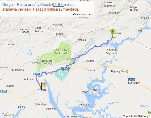 Gerger - Kahta arası yaklaşık olarak 90 km/h ile yukarıda belirtilen sürede olup, iki yerin kuş uçuşu uzaklığı (mesafesi) 45'dir. Yolculuk otobüsle 1 saat 29 dakika sürmektedir.