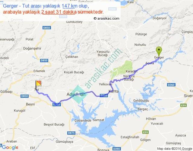 Gerger - Tut arası yaklaşık olarak 90 km/h ile yukarıda belirtilen sürede olup, iki yerin kuş uçuşu uzaklığı (mesafesi) 101'dir. Yolculuk otobüsle 3 saat 16 dakika sürmektedir.