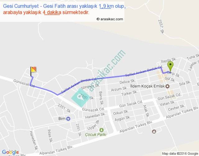 Gesi Cumhuriyet - Gesi Fatih arası yaklaşık olarak 90 km/h ile yukarıda belirtilen sürede olup, iki yerin kuş uçuşu uzaklığı (mesafesi) 2'dir. Yolculuk otobüsle 5 dakika sürmektedir.