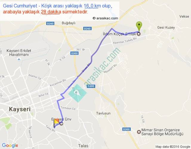 Gesi Cumhuriyet - Köşk arası yaklaşık olarak 90 km/h ile yukarıda belirtilen sürede olup, iki yerin kuş uçuşu uzaklığı (mesafesi) 13'dir. Yolculuk otobüsle 36 dakika sürmektedir.