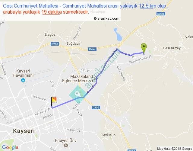 Gesi Cumhuriyet Mahallesi - Cumhuriyet Mahallesi arası yaklaşık olarak 90 km/h ile yukarıda belirtilen sürede olup, iki yerin kuş uçuşu uzaklığı (mesafesi) 10'dir. Yolculuk otobüsle 24 dakika sürmektedir.