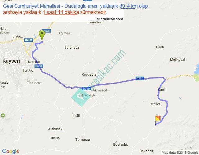 Gesi Cumhuriyet Mahallesi - Dadaloğlu arası yaklaşık olarak 90 km/h ile yukarıda belirtilen sürede olup, iki yerin kuş uçuşu uzaklığı (mesafesi) 54'dir. Yolculuk otobüsle 1 saat 32 dakika sürmektedir.