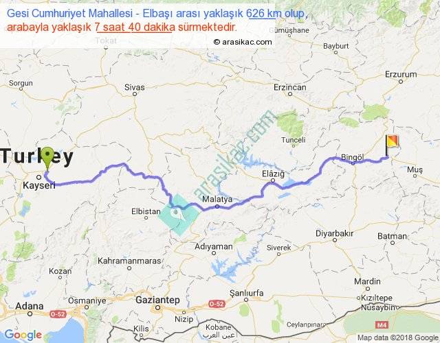Gesi Cumhuriyet Mahallesi - Elbaşı arası yaklaşık olarak 90 km/h ile yukarıda belirtilen sürede olup, iki yerin kuş uçuşu uzaklığı (mesafesi) 467'dir. Eğer belirtilen yerler arasında uçak seferi var ise bu süre uçakla 43 dakika'ya kadar düşebilir. Yolculuk otobüsle 9 saat 58 dakika sürmektedir.