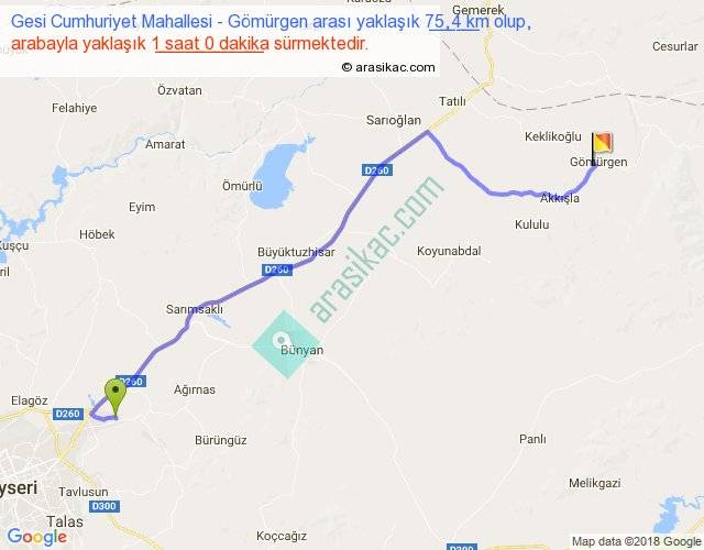 Gesi Cumhuriyet Mahallesi - Gömürgen arası yaklaşık olarak 90 km/h ile yukarıda belirtilen sürede olup, iki yerin kuş uçuşu uzaklığı (mesafesi) 58'dir. Yolculuk otobüsle 1 saat 18 dakika sürmektedir.