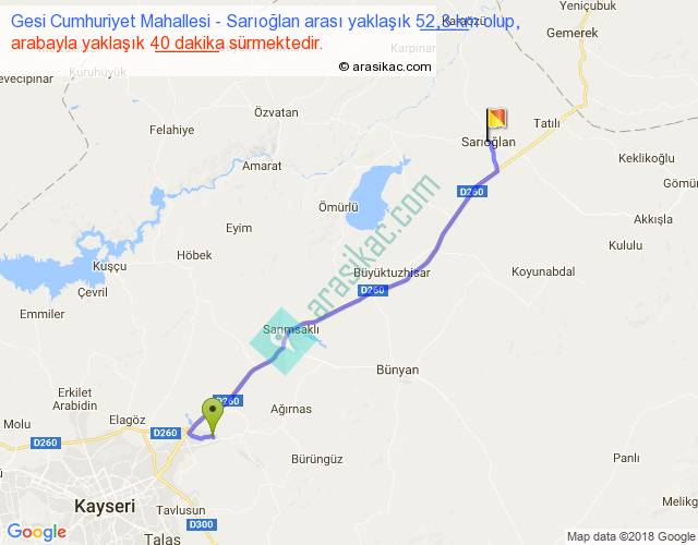 Gesi Cumhuriyet Mahallesi - Sarıoğlan arası yaklaşık olarak 90 km/h ile yukarıda belirtilen sürede olup, iki yerin kuş uçuşu uzaklığı (mesafesi) 44'dir. Yolculuk otobüsle 52 dakika sürmektedir.