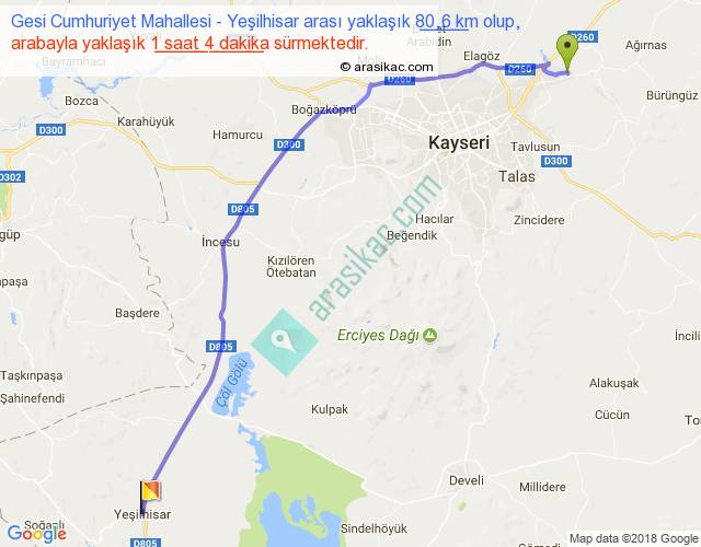 Gesi Cumhuriyet Mahallesi - Yeşilhisar arası yaklaşık olarak 90 km/h ile yukarıda belirtilen sürede olup, iki yerin kuş uçuşu uzaklığı (mesafesi) 66'dir. Yolculuk otobüsle 1 saat 23 dakika sürmektedir.