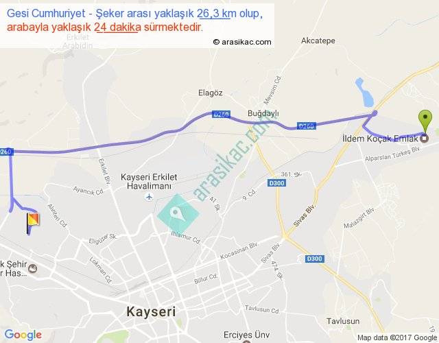 Gesi Cumhuriyet - Şeker arası yaklaşık olarak 90 km/h ile yukarıda belirtilen sürede olup, iki yerin kuş uçuşu uzaklığı (mesafesi) 18'dir. Yolculuk otobüsle 31 dakika sürmektedir.