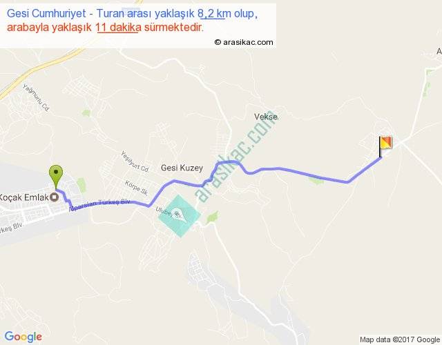 Gesi Cumhuriyet - Turan arası yaklaşık olarak 90 km/h ile yukarıda belirtilen sürede olup, iki yerin kuş uçuşu uzaklığı (mesafesi) 7'dir. Yolculuk otobüsle 14 dakika sürmektedir.