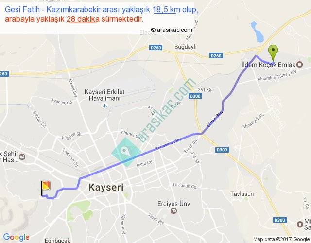 Gesi Fatih - Kazımkarabekir arası yaklaşık olarak 90 km/h ile yukarıda belirtilen sürede olup, iki yerin kuş uçuşu uzaklığı (mesafesi) 16'dir. Yolculuk otobüsle 36 dakika sürmektedir.