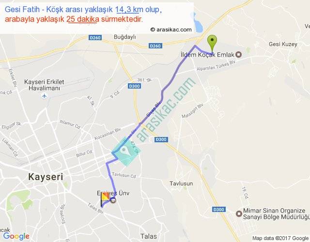 Gesi Fatih - Köşk arası yaklaşık olarak 90 km/h ile yukarıda belirtilen sürede olup, iki yerin kuş uçuşu uzaklığı (mesafesi) 12'dir. Yolculuk otobüsle 32 dakika sürmektedir.