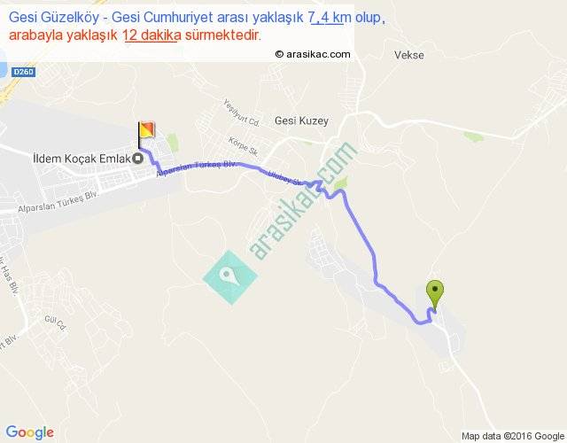 Gesi Güzelköy - Gesi Cumhuriyet arası yaklaşık olarak 90 km/h ile yukarıda belirtilen sürede olup, iki yerin kuş uçuşu uzaklığı (mesafesi) 6'dir. Yolculuk otobüsle 15 dakika sürmektedir.