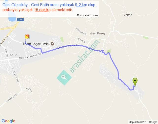 Gesi Güzelköy - Gesi Fatih arası yaklaşık olarak 90 km/h ile yukarıda belirtilen sürede olup, iki yerin kuş uçuşu uzaklığı (mesafesi) 7'dir. Yolculuk otobüsle 19 dakika sürmektedir.