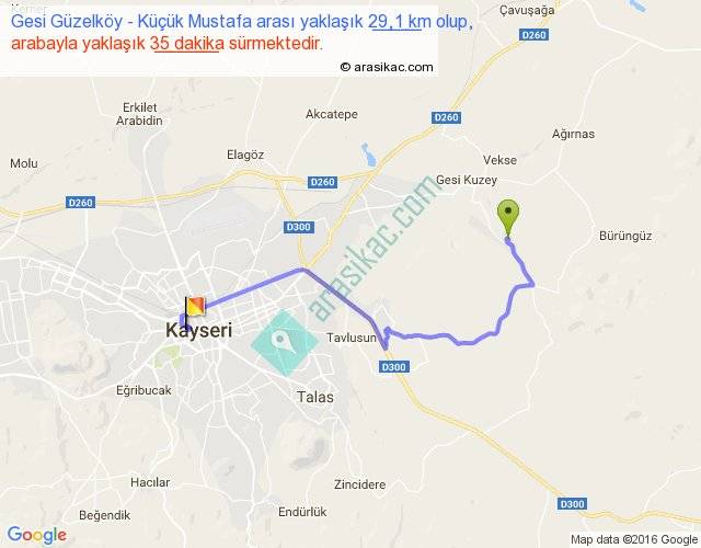 Gesi Güzelköy - Küçük Mustafa arası yaklaşık olarak 90 km/h ile yukarıda belirtilen sürede olup, iki yerin kuş uçuşu uzaklığı (mesafesi) 18'dir. Yolculuk otobüsle 45 dakika sürmektedir.