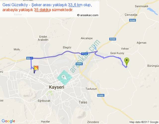 Gesi Güzelköy - Şeker arası yaklaşık olarak 90 km/h ile yukarıda belirtilen sürede olup, iki yerin kuş uçuşu uzaklığı (mesafesi) 22'dir. Yolculuk otobüsle 45 dakika sürmektedir.