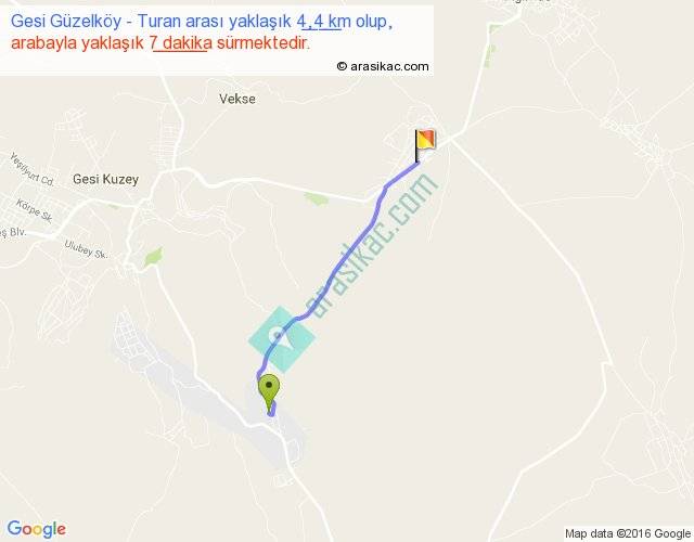 Gesi Güzelköy - Turan arası yaklaşık olarak 90 km/h ile yukarıda belirtilen sürede olup, iki yerin kuş uçuşu uzaklığı (mesafesi) 4'dir. Yolculuk otobüsle 9 dakika sürmektedir.
