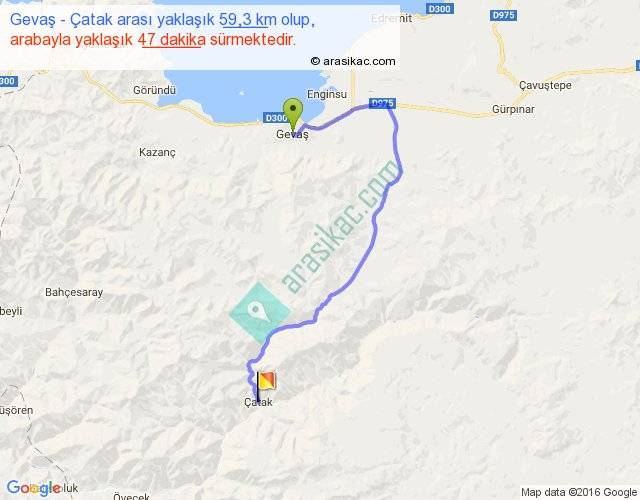 Gevaş - Çatak arası yaklaşık olarak 90 km/h ile yukarıda belirtilen sürede olup, iki yerin kuş uçuşu uzaklığı (mesafesi) 32'dir. Yolculuk otobüsle 1 saat 1 dakika sürmektedir.