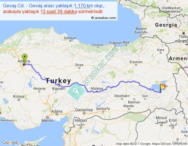 Gevaş Cd. - Gevaş arası yaklaşık olarak 90 km/h ile yukarıda belirtilen sürede olup, iki yerin kuş uçuşu uzaklığı (mesafesi) 890'dir. Eğer belirtilen yerler arasında uçak seferi var ise bu süre uçakla 1 saat 22 dakika'ya kadar düşebilir. Yolculuk otobüsle 17 saat 44 dakika sürmektedir.