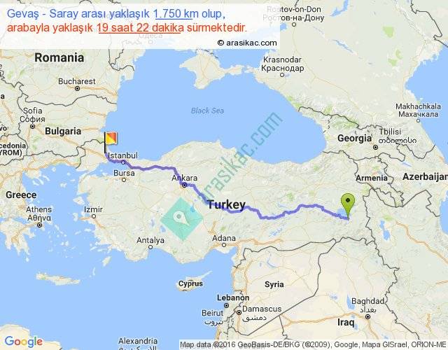 Gevaş - Saray arası yaklaşık olarak 90 km/h ile yukarıda belirtilen sürede olup, iki yerin kuş uçuşu uzaklığı (mesafesi) 1332'dir. Eğer belirtilen yerler arasında uçak seferi var ise bu süre uçakla 2 saat 02 dakika'ya kadar düşebilir. Yolculuk otobüsle 1 gün 1 saat sürmektedir.