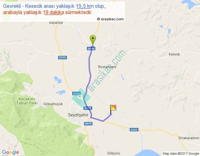 Gevrekli - Kesecik arası yaklaşık olarak 90 km/h ile yukarıda belirtilen sürede olup, iki yerin kuş uçuşu uzaklığı (mesafesi) 14'dir. Yolculuk otobüsle 24 dakika sürmektedir.