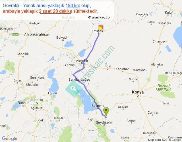 Gevrekli - Yunak arası yaklaşık olarak 90 km/h ile yukarıda belirtilen sürede olup, iki yerin kuş uçuşu uzaklığı (mesafesi) 141'dir. Yolculuk otobüsle 3 saat 12 dakika sürmektedir.