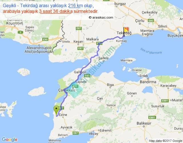 Geyikli - Tekirdağ arası yaklaşık olarak 90 km/h ile yukarıda belirtilen sürede olup, iki yerin kuş uçuşu uzaklığı (mesafesi) 170'dir. Yolculuk otobüsle 4 saat 40 dakika sürmektedir.