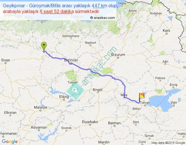 Geyikpınar - Güroymak Bitlis arası yaklaşık olarak 90 km/h ile yukarıda belirtilen sürede olup, iki yerin kuş uçuşu uzaklığı (mesafesi) 349'dir. Eğer belirtilen yerler arasında uçak seferi var ise bu süre uçakla 32 dakika'ya kadar düşebilir. Yolculuk otobüsle 8 saat 55 dakika sürmektedir.