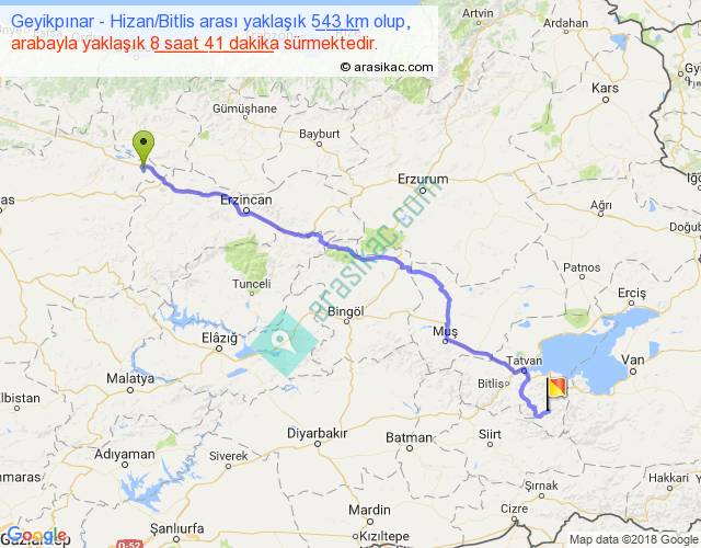 Geyikpınar - Hizan Bitlis arası yaklaşık olarak 90 km/h ile yukarıda belirtilen sürede olup, iki yerin kuş uçuşu uzaklığı (mesafesi) 405'dir. Eğer belirtilen yerler arasında uçak seferi var ise bu süre uçakla 37 dakika'ya kadar düşebilir. Yolculuk otobüsle 11 saat 17 dakika sürmektedir.