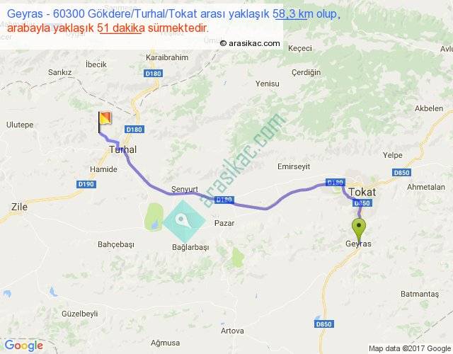 Geyras - 60300 Gökdere Turhal Tokat arası yaklaşık olarak 90 km/h ile yukarıda belirtilen sürede olup, iki yerin kuş uçuşu uzaklığı (mesafesi) 46'dir. Yolculuk otobüsle 1 saat 6 dakika sürmektedir.