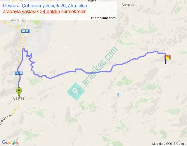 Geyras - Çat arası yaklaşık olarak 90 km/h ile yukarıda belirtilen sürede olup, iki yerin kuş uçuşu uzaklığı (mesafesi) 15'dir. Yolculuk otobüsle 44 dakika sürmektedir.