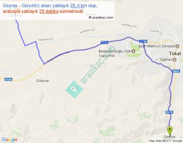 Geyras - Güryıldız arası yaklaşık olarak 90 km/h ile yukarıda belirtilen sürede olup, iki yerin kuş uçuşu uzaklığı (mesafesi) 20'dir. Yolculuk otobüsle 37 dakika sürmektedir.