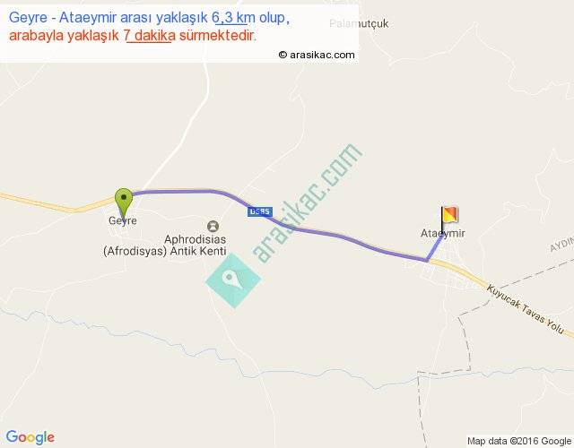 Geyre - Ataeymir arası yaklaşık olarak 90 km/h ile yukarıda belirtilen sürede olup, iki yerin kuş uçuşu uzaklığı (mesafesi) 5'dir. Yolculuk otobüsle 9 dakika sürmektedir.