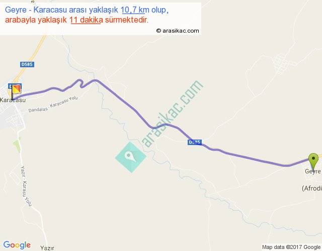 Geyre - Karacasu arası yaklaşık olarak 90 km/h ile yukarıda belirtilen sürede olup, iki yerin kuş uçuşu uzaklığı (mesafesi) 9'dir. Yolculuk otobüsle 14 dakika sürmektedir.