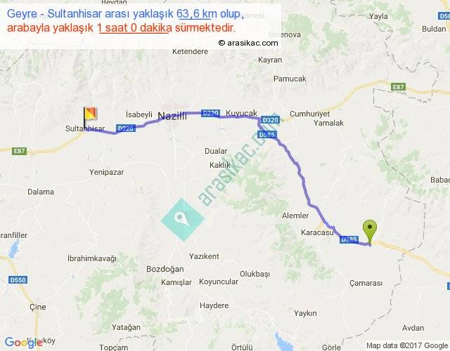 Geyre - Sultanhisar arası yaklaşık olarak 90 km/h ile yukarıda belirtilen sürede olup, iki yerin kuş uçuşu uzaklığı (mesafesi) 52'dir. Yolculuk otobüsle 1 saat 18 dakika sürmektedir.