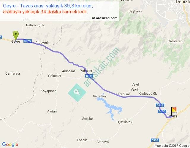 Geyre - Tavas arası yaklaşık olarak 90 km/h ile yukarıda belirtilen sürede olup, iki yerin kuş uçuşu uzaklığı (mesafesi) 35'dir. Yolculuk otobüsle 44 dakika sürmektedir.