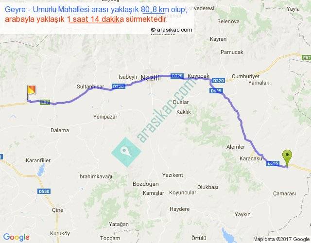 Geyre - Umurlu Mahallesi arası yaklaşık olarak 90 km/h ile yukarıda belirtilen sürede olup, iki yerin kuş uçuşu uzaklığı (mesafesi) 66'dir. Yolculuk otobüsle 1 saat 36 dakika sürmektedir.