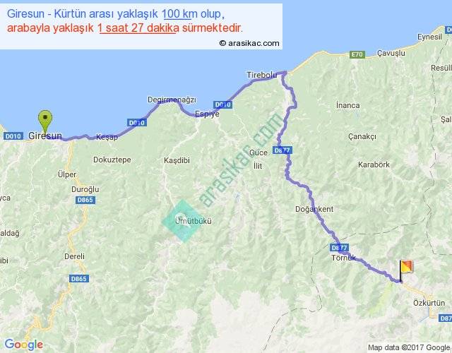 Giresun - Kürtün arası yaklaşık olarak 90 km/h ile yukarıda belirtilen sürede olup, iki yerin kuş uçuşu uzaklığı (mesafesi) 63'dir. Yolculuk otobüsle 1 saat 53 dakika sürmektedir.