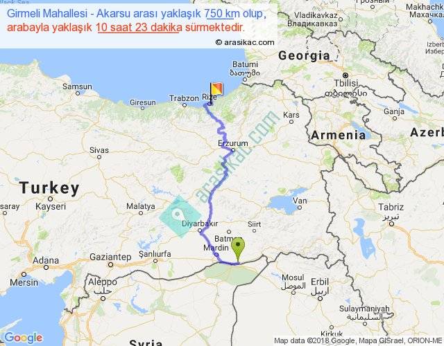 Girmeli Mahallesi - Akarsu arası yaklaşık olarak 90 km/h ile yukarıda belirtilen sürede olup, iki yerin kuş uçuşu uzaklığı (mesafesi) 437'dir. Eğer belirtilen yerler arasında uçak seferi var ise bu süre uçakla 40 dakika'ya kadar düşebilir. Yolculuk otobüsle 13 saat 29 dakika sürmektedir.