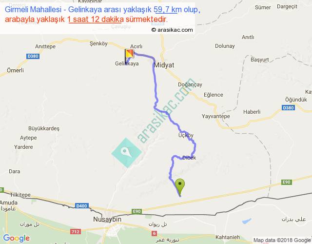 Girmeli Mahallesi - Gelinkaya arası yaklaşık olarak 90 km/h ile yukarıda belirtilen sürede olup, iki yerin kuş uçuşu uzaklığı (mesafesi) 35'dir. Yolculuk otobüsle 1 saat 33 dakika sürmektedir.