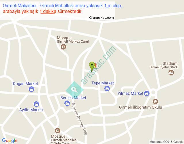 Girmeli Mahallesi - Girmeli Mahallesi arası yaklaşık olarak 90 km/h ile yukarıda belirtilen sürede olup, iki yerin kuş uçuşu uzaklığı (mesafesi) 0'dir. Yolculuk otobüsle 1 dakika sürmektedir.