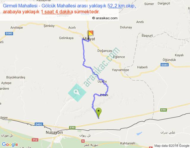Girmeli Mahallesi - Gölcük Mahallesi arası yaklaşık olarak 90 km/h ile yukarıda belirtilen sürede olup, iki yerin kuş uçuşu uzaklığı (mesafesi) 32'dir. Yolculuk otobüsle 1 saat 23 dakika sürmektedir.