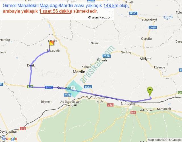 Girmeli Mahallesi - Mazıdağı Mardin arası yaklaşık olarak 90 km/h ile yukarıda belirtilen sürede olup, iki yerin kuş uçuşu uzaklığı (mesafesi) 94'dir. Yolculuk otobüsle 2 saat 30 dakika sürmektedir.